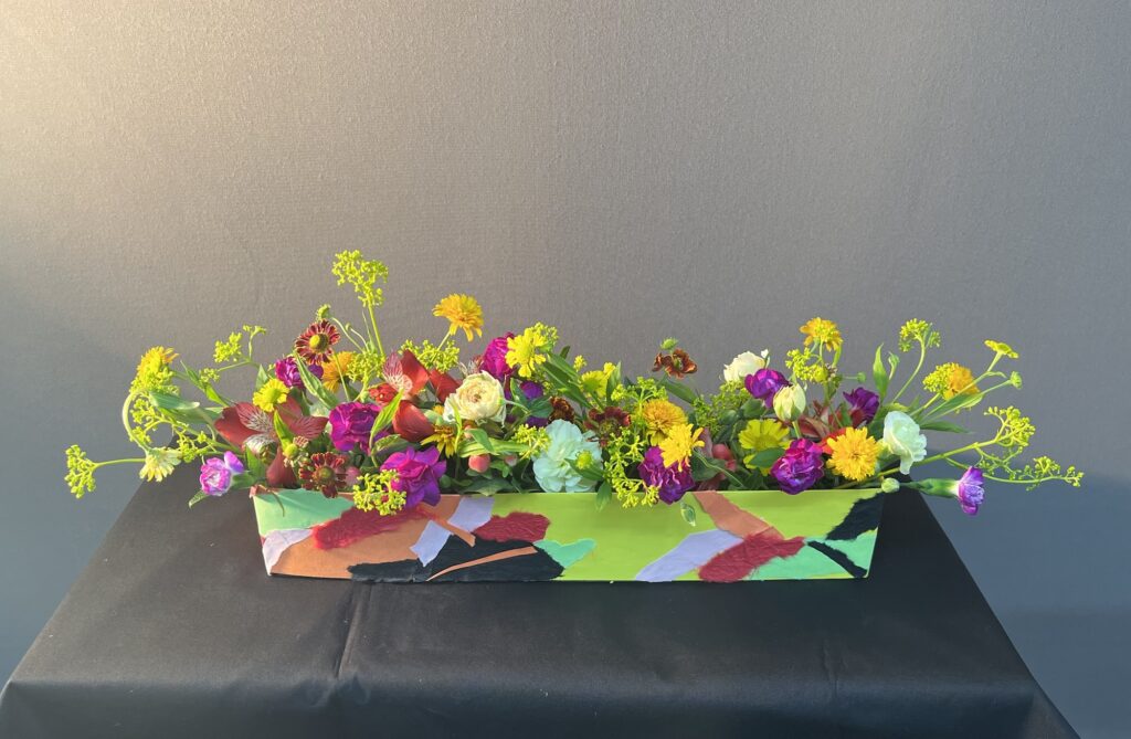 器に紙をはり、器と花の色をあえて、けばけばしくするのがポイントです✨